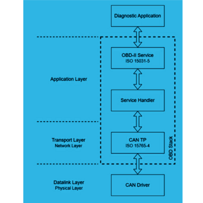 The OBD-II Stack is a standards-compliant diagnostic software implementation based on ISO 15031-5, enabling regulated diagnostic access to vehicle ECUs. It ensures interoperability with diagnostic tools used during manufacturing, service, and compliance testing.